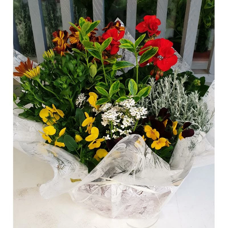Composition de fleurs naturelles en racinées réalisée avec les plantes de saison et selon l’arrivage