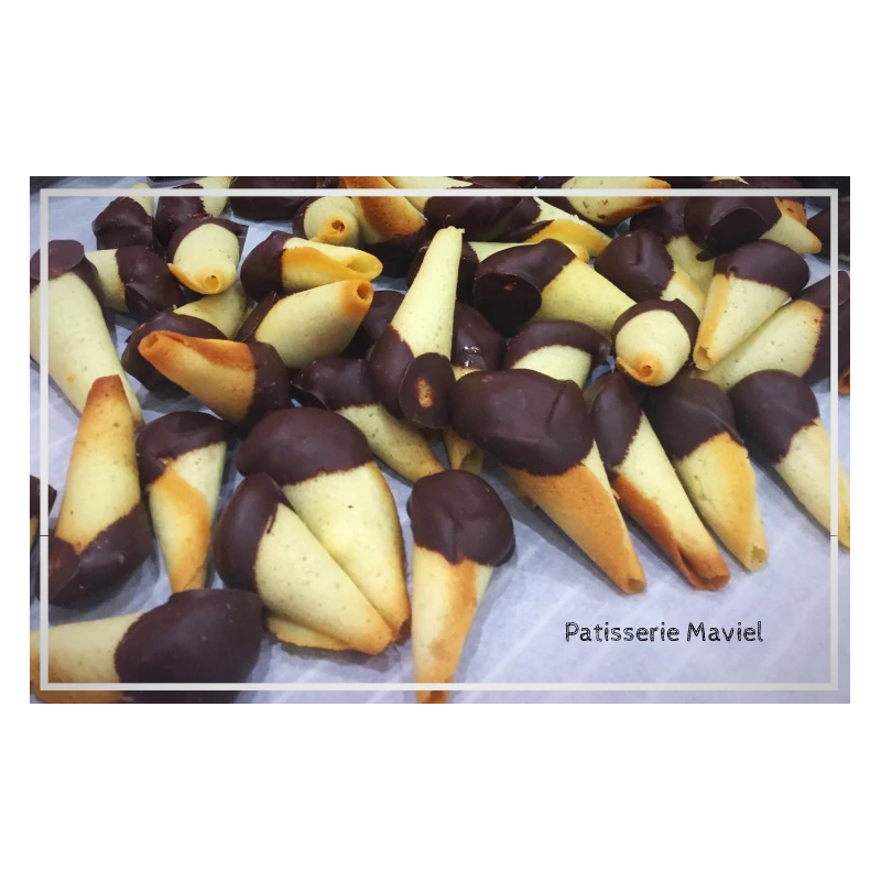 Les cornets sont composés de beurre, praliné amandes-noisettes, sucre, blanc d’œuf, farine et chocolat noir.