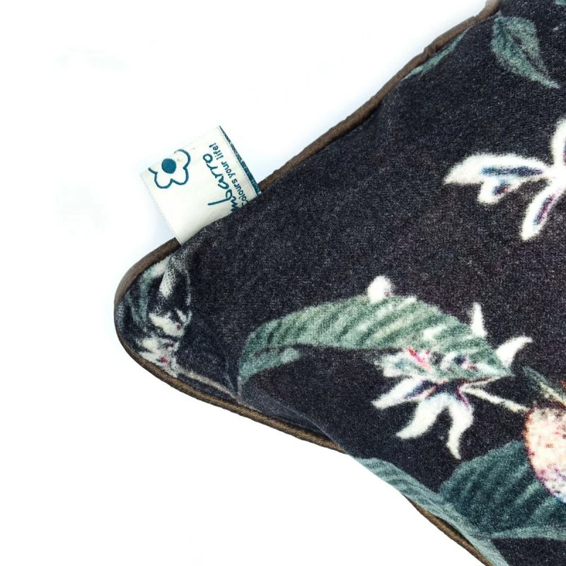Beaucoup de belles choses de la nature peuvent ĂȘtre vues sur ce coussin en velours doux d’Imbarro. Le fond aubergine est la couleur tendance du moment et apporte une si belle ode Ă la nature.