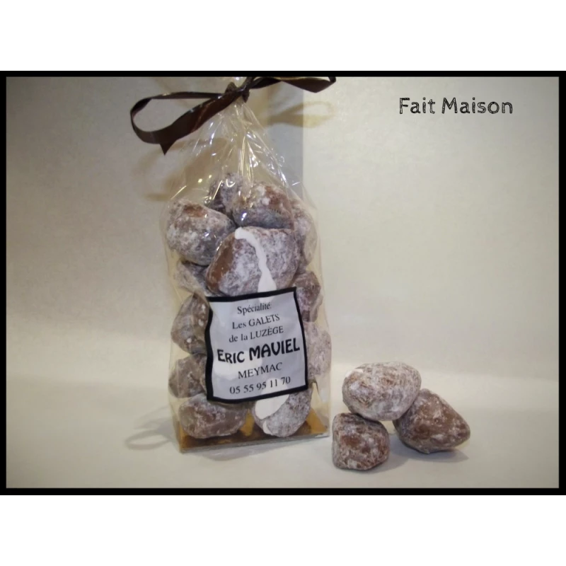 Nos Galets sont composés de blanc d’œuf, sucre, miel, glucose, amandes, écorce d’orange et chocolat au lait.